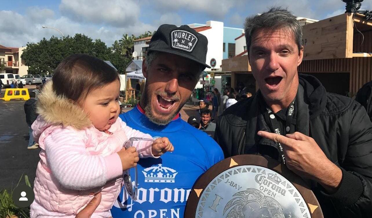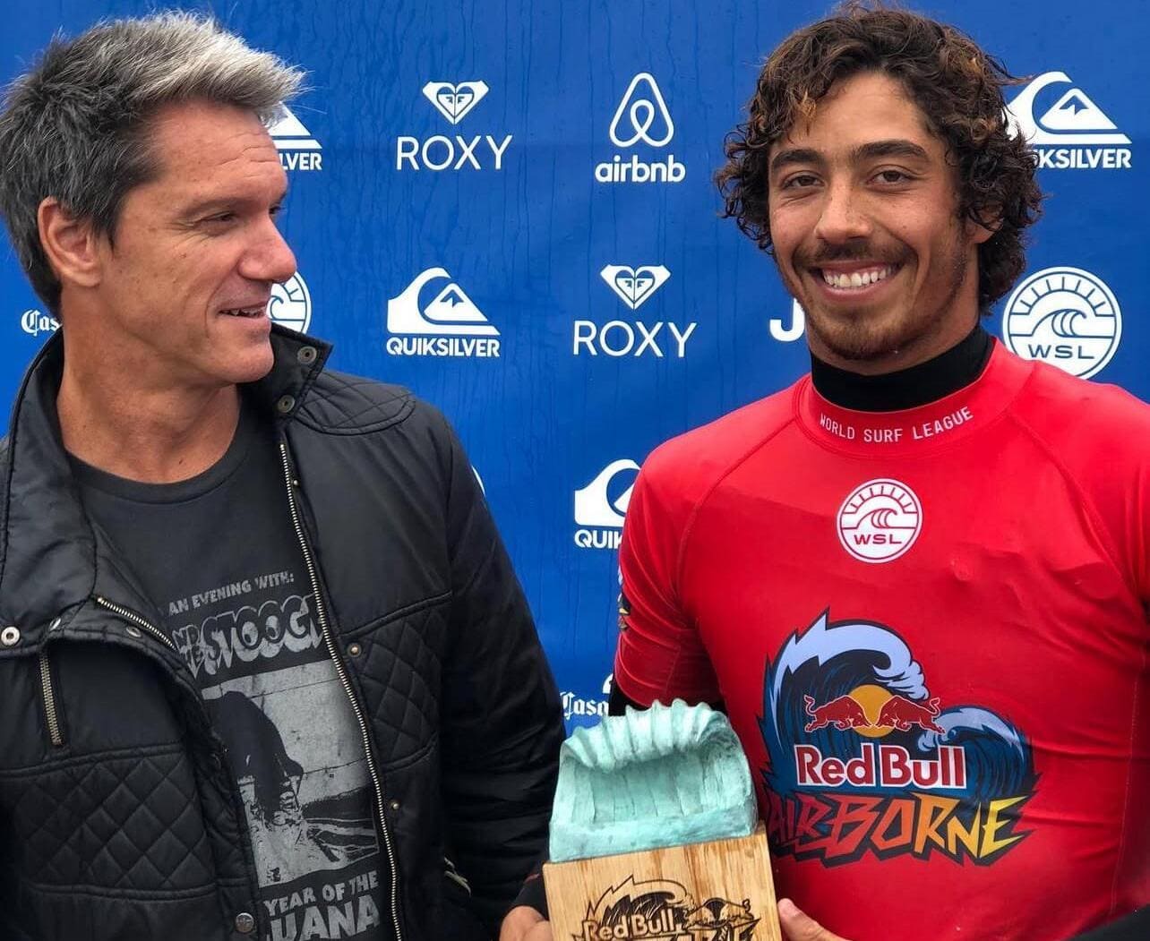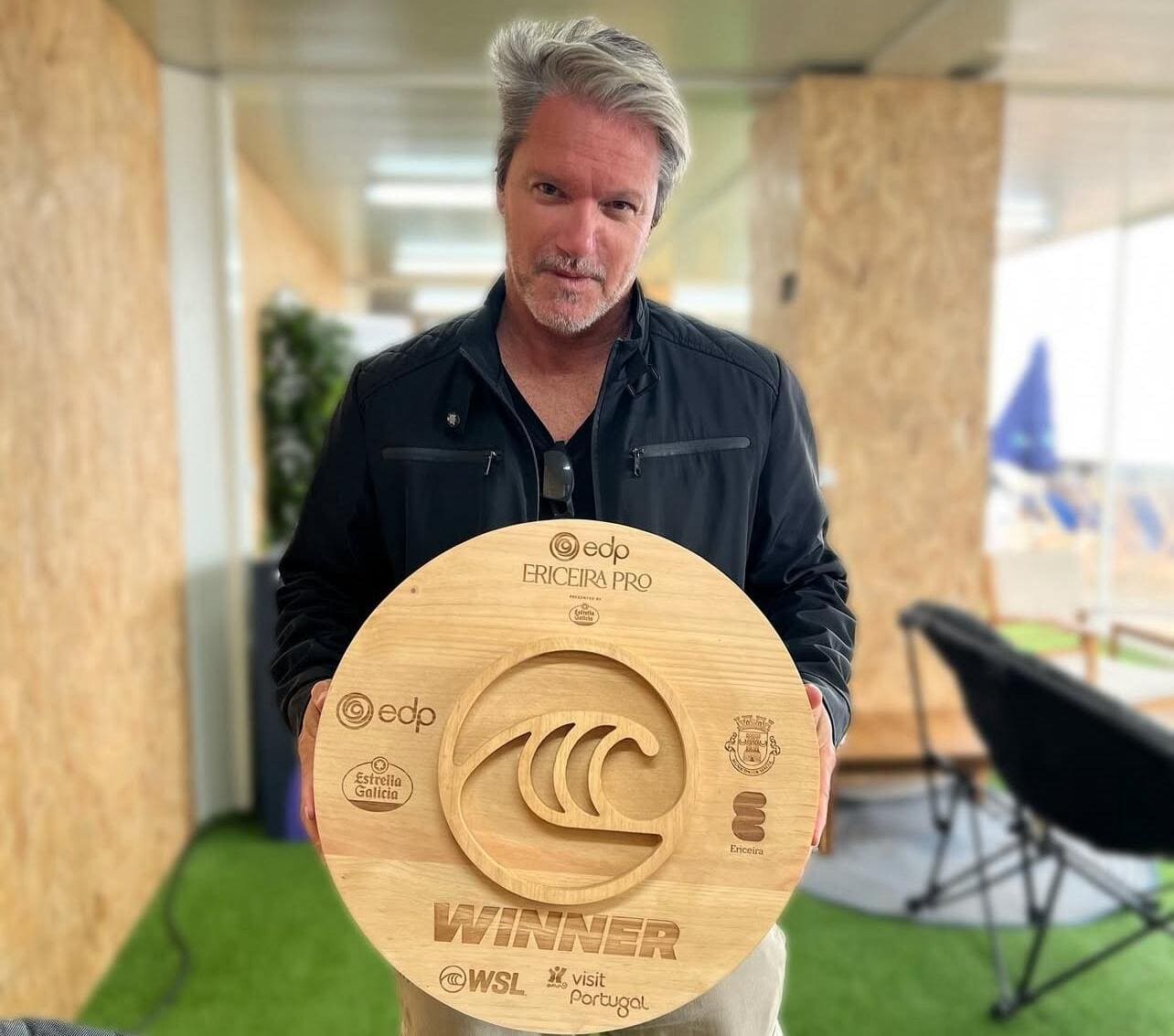 Pedro Burckauser celebra a vitória de Italo Ferreira na etapa de Peniche, Portugal, em 2019. Foto: People on Tour